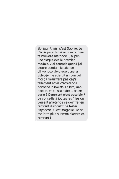 Il est naturel de vouloir des résultats rapidement, mais dans Hypno'Déclic, l'idée est de changer de perspective. L’objectif premier est avant tout de te reconnecter avec toi-même et de comprendre en profondeur ce qui influence ta relation à la nourriture. Les changements durables viennent souvent quand on lâche la pression et qu’on laisse les déclics se faire naturellement, sans attendre de "récompense" immédiate.